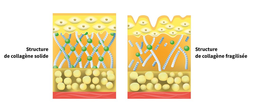 Différents facteurs comme l’alimentation, l’exposition aux rayons UV ou les variations hormonales contribuent à réduire la synthèse endogène du collagène dès 25 ans environ, entraînant des signes visibles de vieillissement de la peau et une baisse de la solidité et de la stabilité des os, des articulations, des tendons et des ligaments.