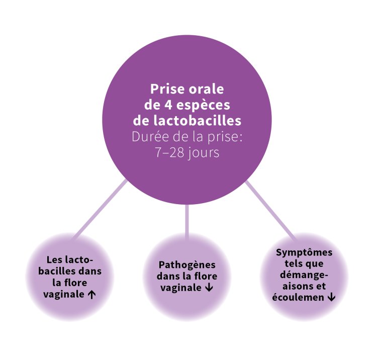 La prise de préparations probiotiques peut augmenter le nombre de lactobacilles dans la flore vaginale et inhiber ainsi le développement de micro-organismes potentiellement pathogènes, ce qui contribue à préserver l’équilibre de la flore vaginale. Pour une flore vaginale saine, une bonne hygiène intime à l’eau tiède, avec un savon au pH neutre, est également importante.