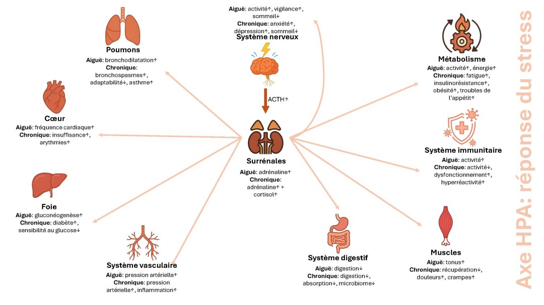 Le stress de courte durée active le système nerveux sympathique et entraîne la libération d’adrénaline, la réaction classique de fuite ou de lutte («fight or flight»). Si le stress persiste, l’axe hypothalamo-hypophyso-surrénalien (axe HPA) est stimulé. Le cortisol, l’hormone du stress, reste élevé pendant des heures. Si ce processus se répète, différentes fonctions corporelles peuvent en être affectées à long terme.